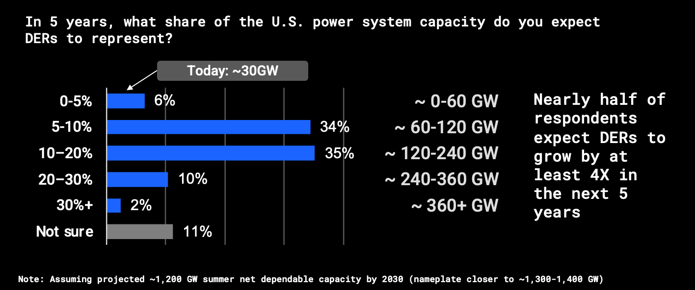 That confident spirit was channeled at the start of the day by DERTF-cofounder (and Scale Microgrids Senior Director of Strategy) Colleen Metelitsa, shimmering in her usual-for-DERVOS sequined jumpsuit, as she shared the results of the group’s first annual Community Survey. In presenting the survey’s results the previous day at the also-first DERVOS Leadership Summit – a smaller convening at Newlab in the Brooklyn Navy Yard, which had hosted previous DERVOSes – one slide in particular was called out as “the LFG slide”: nearly 50% of respondents expect DERs to at least 4x their contribution to the US power system in just five years, from 30 GW today to 120 GW or more.